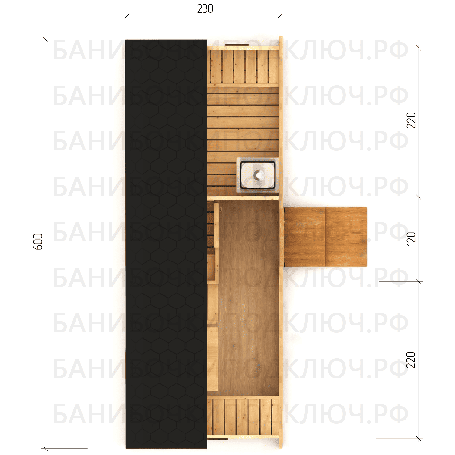 комната отдыха – 200х300, парная 180х220, мойка 120х220